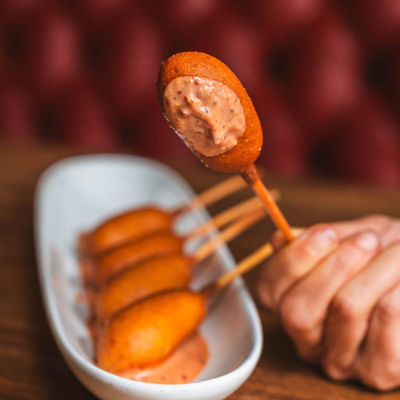 fried brick cheese, cornbread batter, hot honey